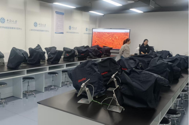 团队重点考察了湘雅医公司显微、解剖、人体机能学实验室以及长沙民政职业技术公司的智能化基础医学实验室。湘雅医公司显微实验室作为智能无线互动教室,在智能化互动场景体验、多方位教学反馈、定制化桌台布局及局域无线网建设等方面展现了高标准的建设理念。解剖实验室采用了“数字+实体解剖”的教学模式,结合数字虚拟仿真系统,实现了传统教学与现代科技的深度融合。人体机能学实验室通过多样化实验套装与智能化实验步骤指导,保障了实验教学的系统性与科学性。